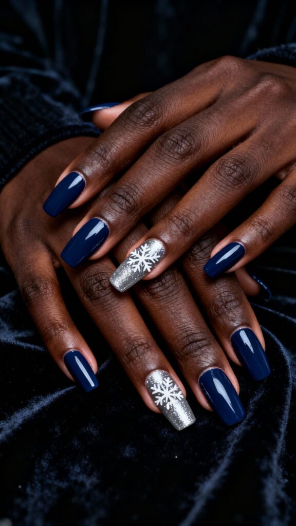 Winter calls for nail designs that match the season’s rich, cozy vibes. Deep jewel tones, metallic finishes, and warm hues look stunning against darker skin tones during the colder months.
